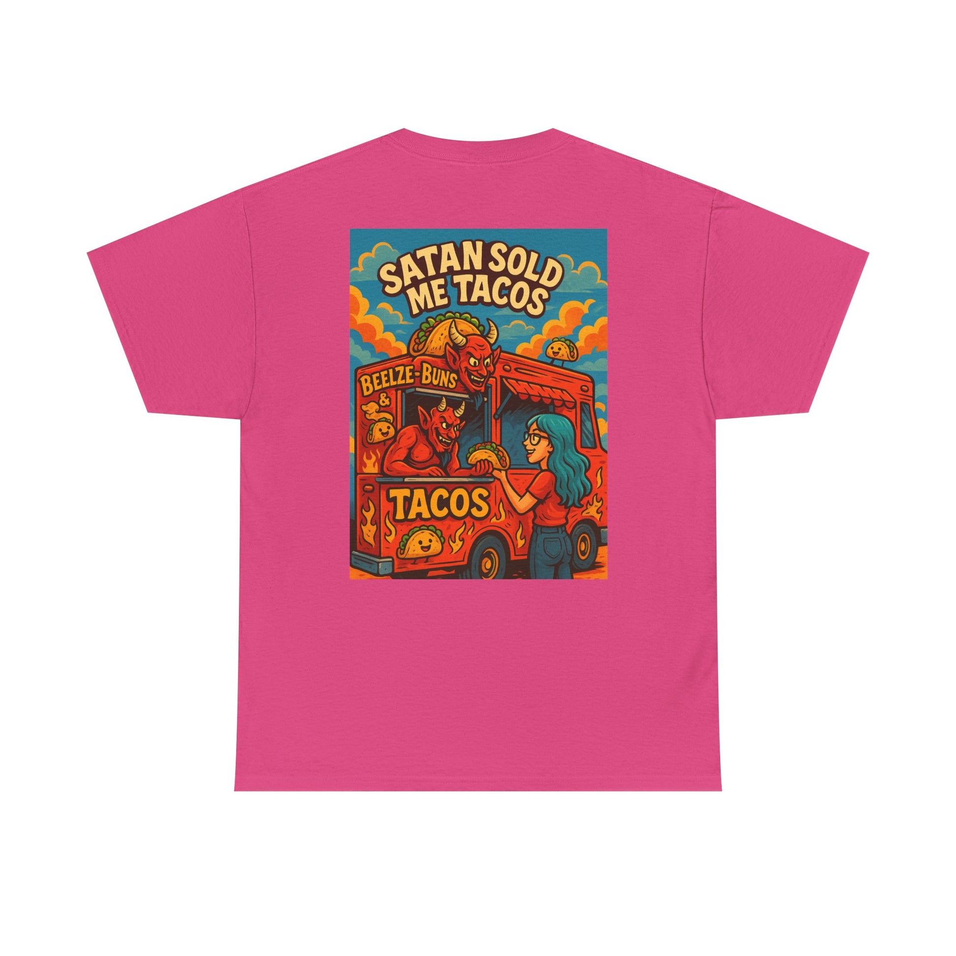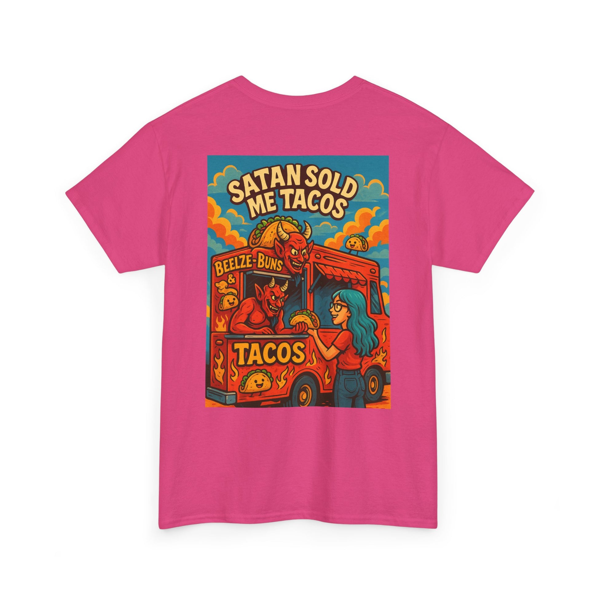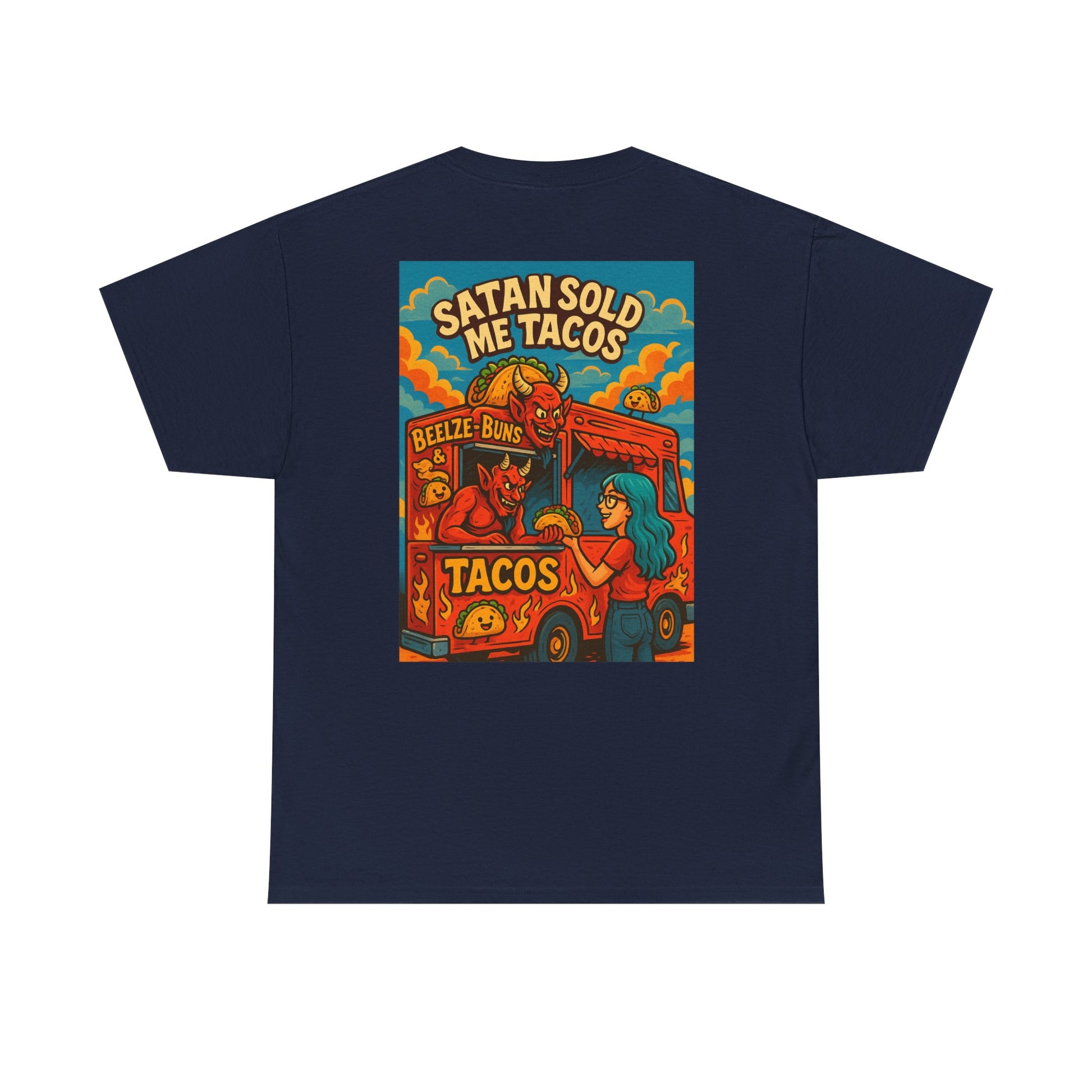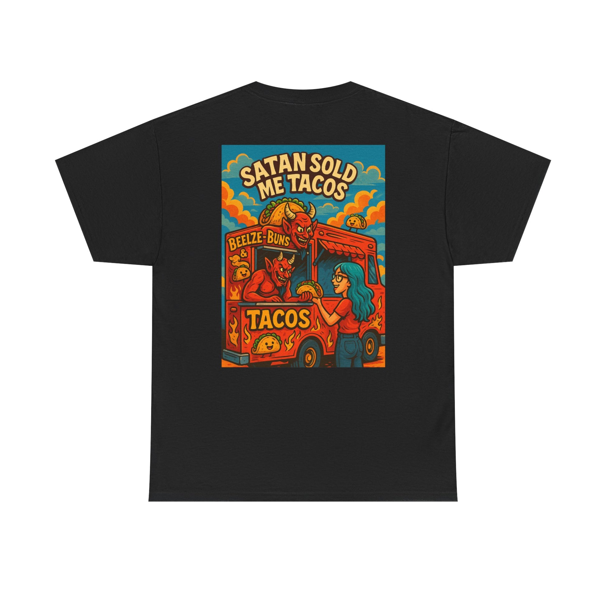 Straight from the pits of flavor comes the Beelze-Buns & Tacos tee! Featuring Satan himself slinging tacos and buns hotter than your ex's takes, this shirt is perfect for foodies, fiends, and fans of funny fashion. Wear it and serve sinfully good looks. #FoodieShirt #FunnyTshirt #TacoLover #StreetwearHumor #TikTokFinds