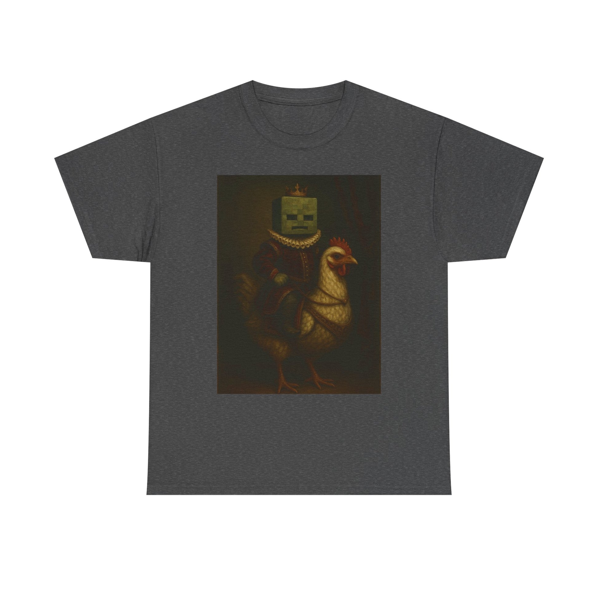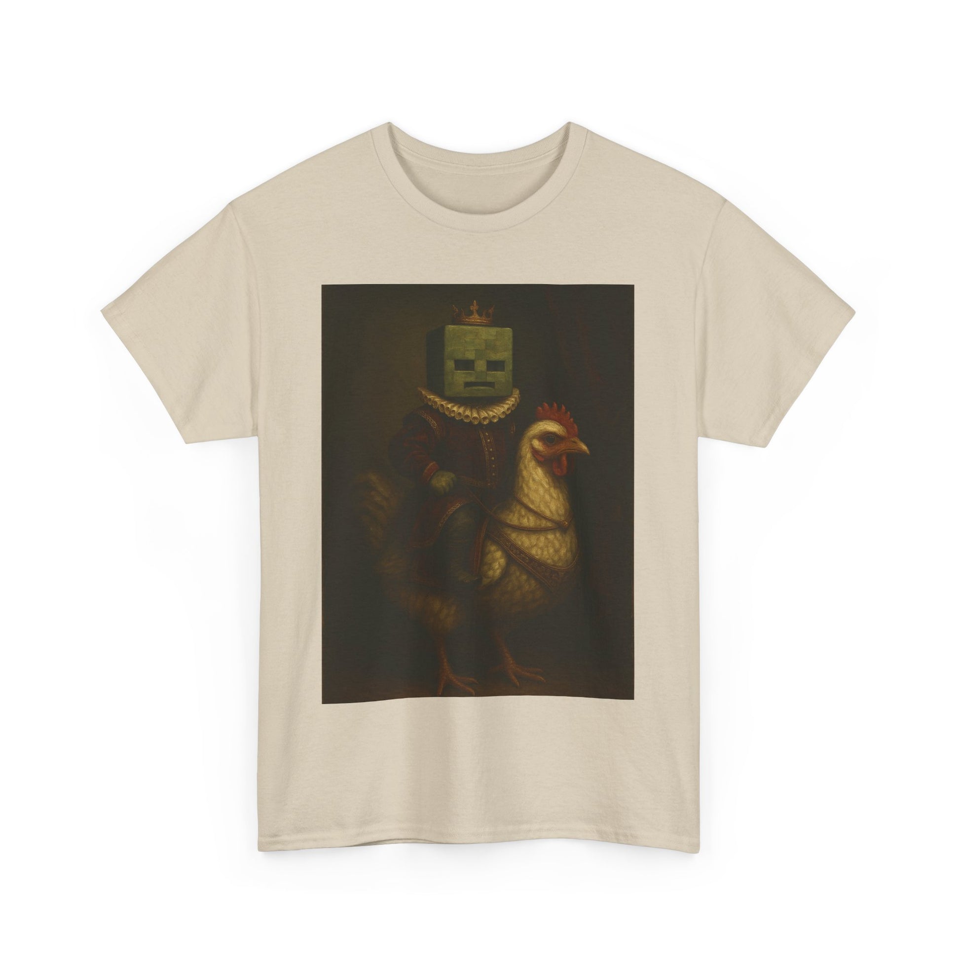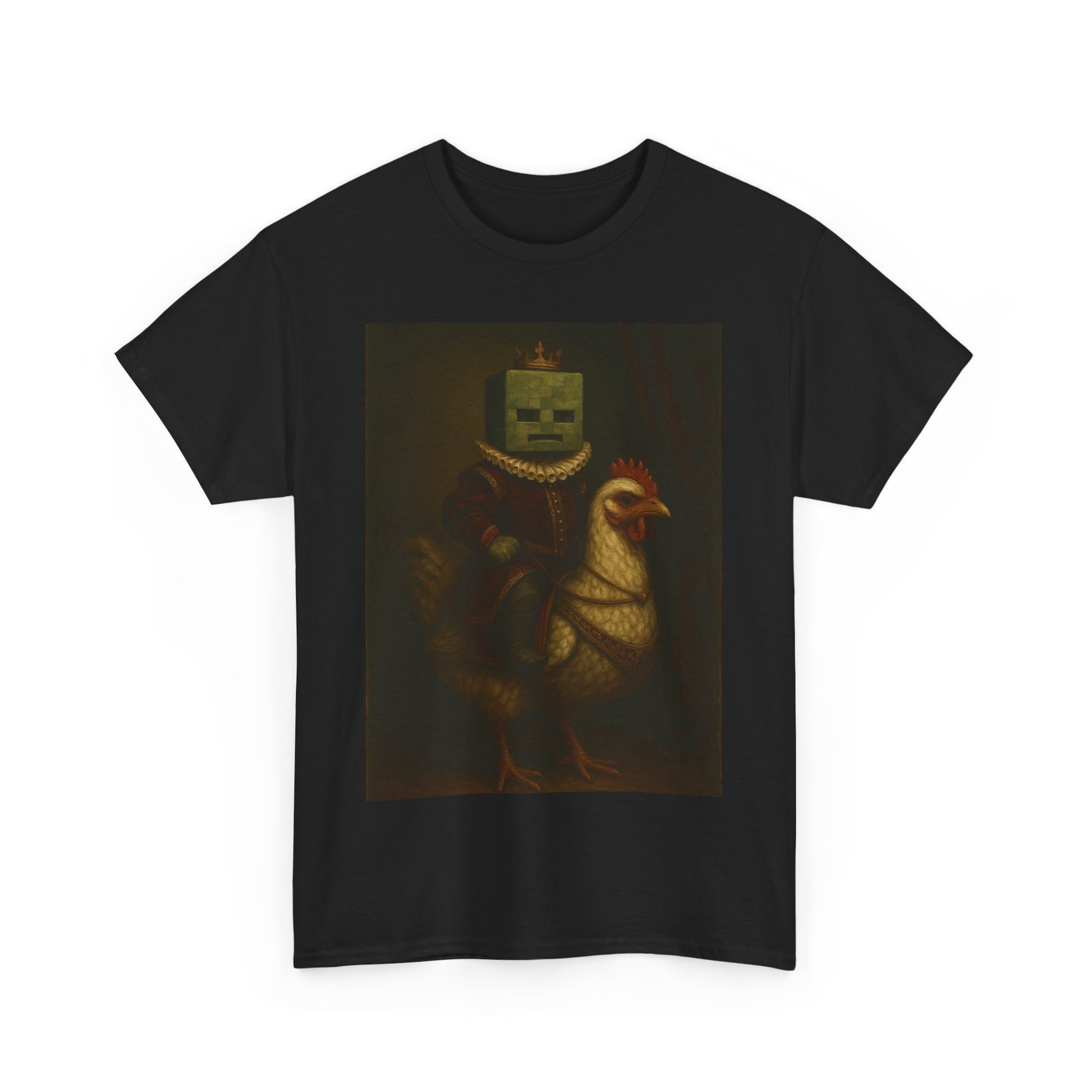 Behold! The most noble nonsense ever stitched into fabric. This isn't just a t-shirt—it's a cluckin' masterpiece. Inspired by the viral Minecraft Chicken Jockey and painted with all the pomp of a 16th-century oil portrait, this shirt turns pixel chaos into renaissance royalty.