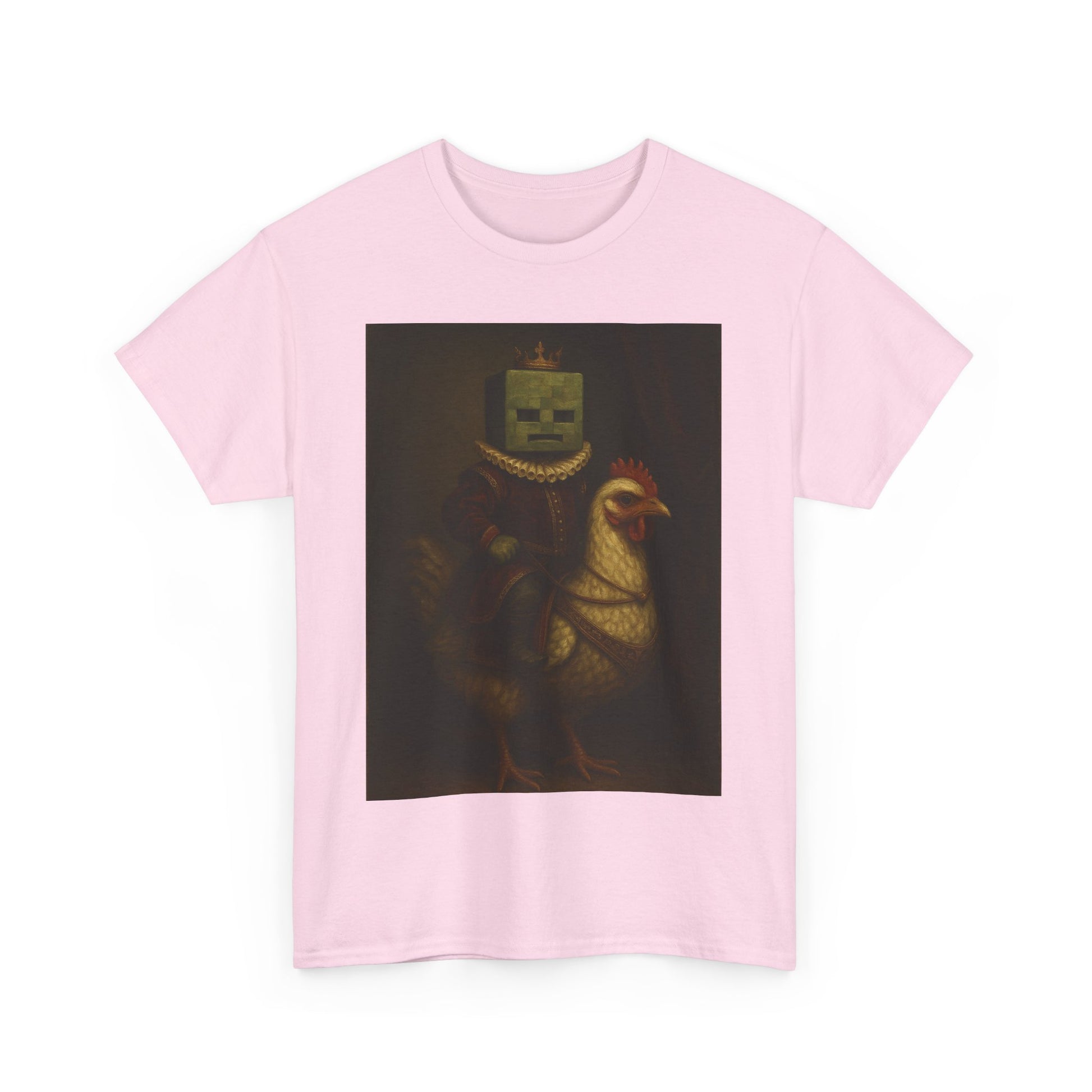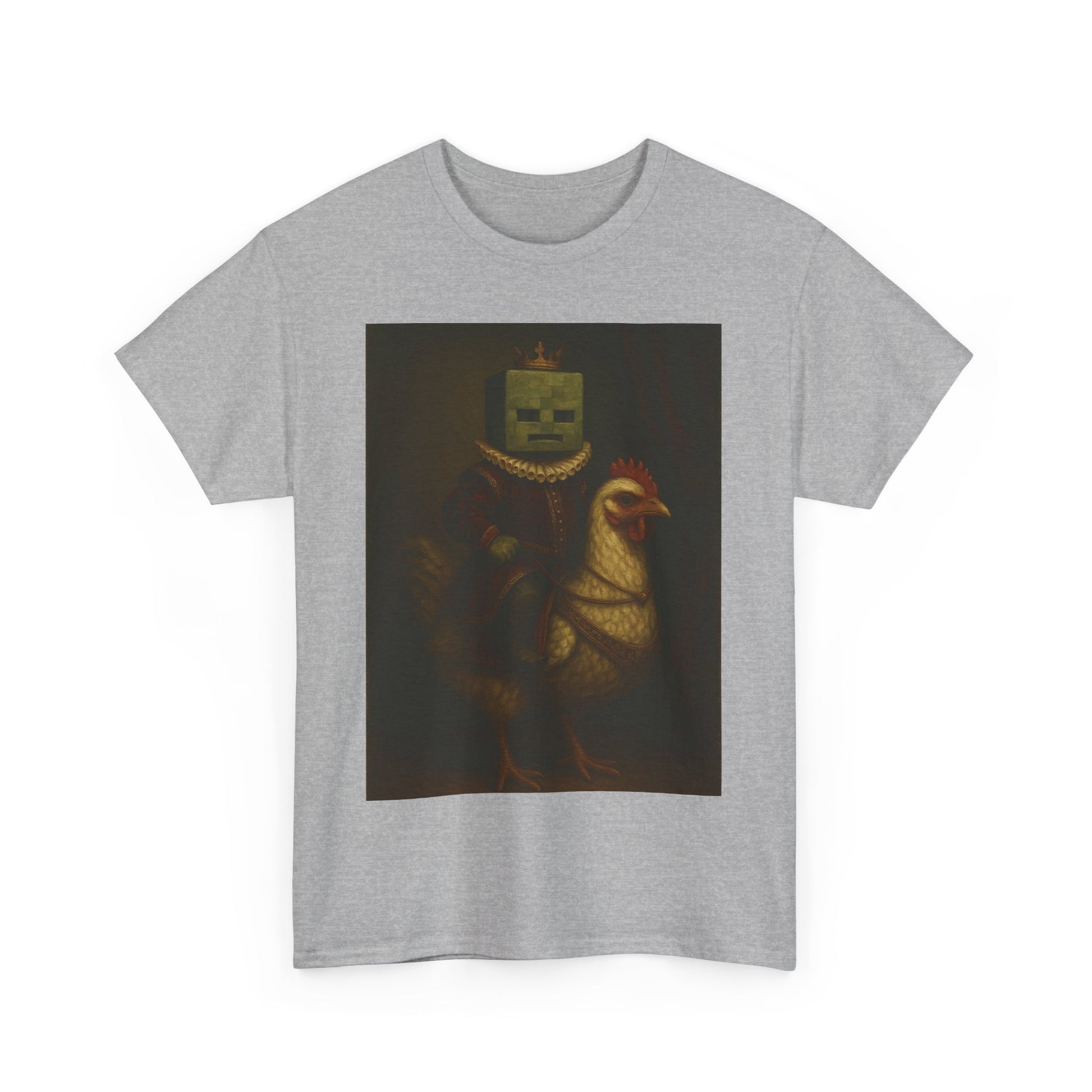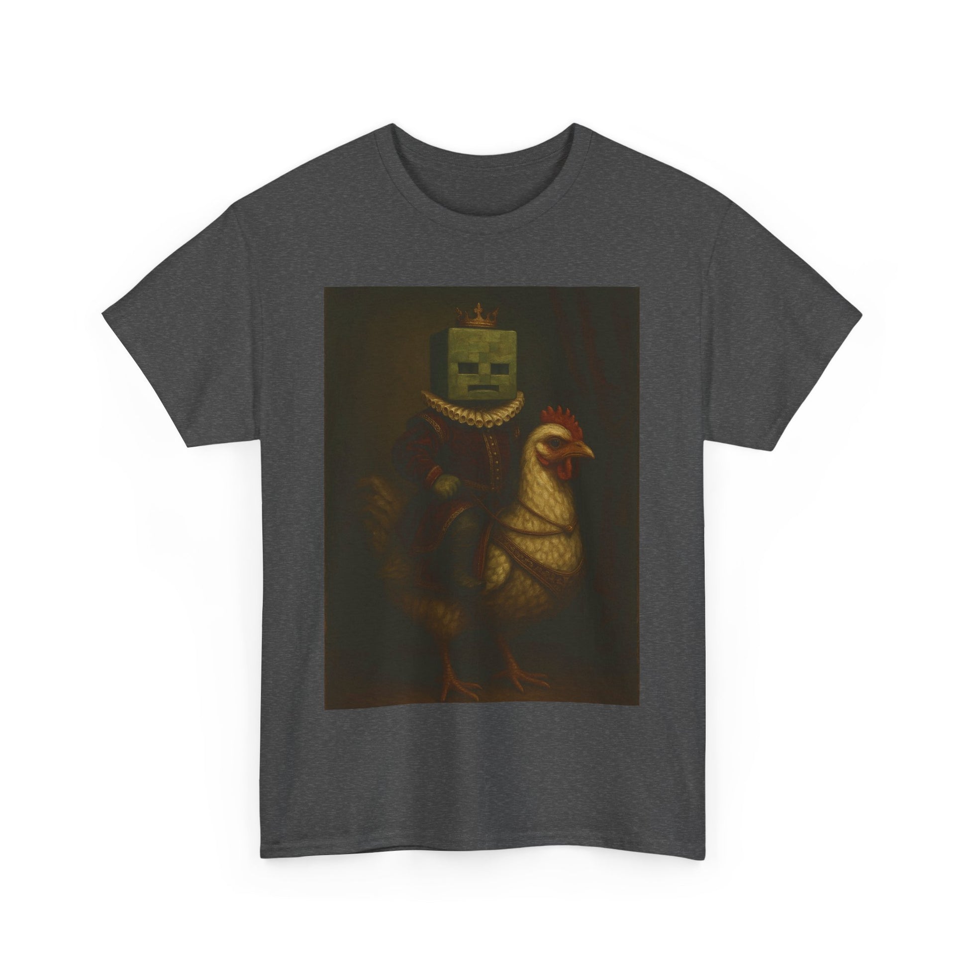 Behold! The most noble nonsense ever stitched into fabric. This isn't just a t-shirt—it's a cluckin' masterpiece. Inspired by the viral Minecraft Chicken Jockey and painted with all the pomp of a 16th-century oil portrait, this shirt turns pixel chaos into renaissance royalty.